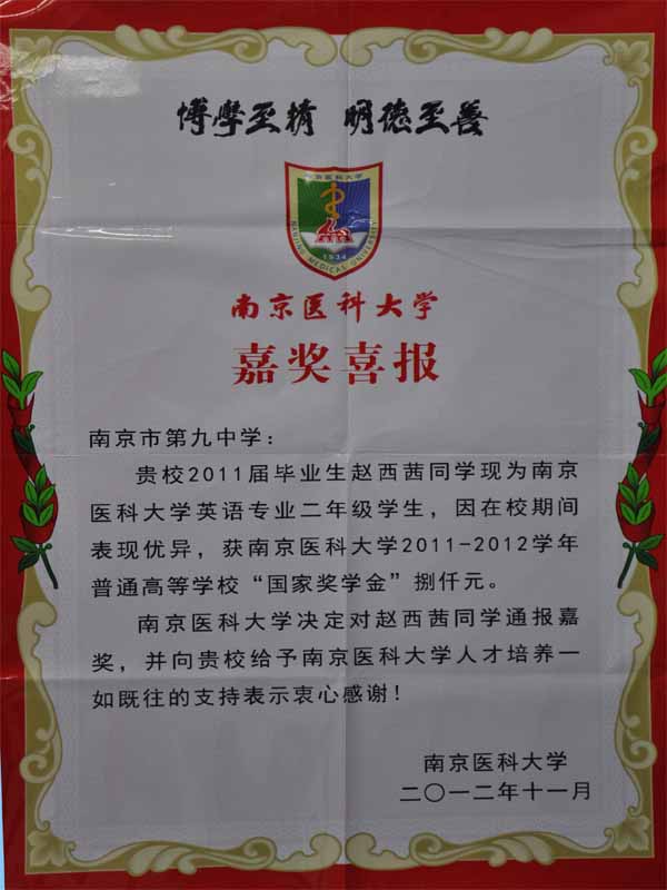 我校2011届毕业生赵西茜喜获南京医科大学2011-2012学年普通高等学校“国家奖学金”八千元,南京医科大学对赵西茜同学作了通报嘉奖。在此,我校对赵西茜同学表示衷心的祝贺!也我我校拥有这样优秀的毕业生而自豪!