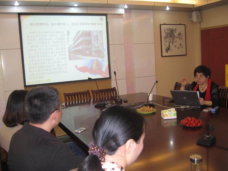 王伏才校长介绍了我校的办学历史、办学理念及办学特色,并从个人成长的角度谈到了艺术教育对提升学生修养、促进学生全面发展的作用。音乐组教研组长张薇老师、音乐特级钱逸瑞老师精心制作了ppt,向大家详细介绍了我校省艺术特色课程基地的建设情况,并带领他们参观了我校的文艺中心、演播厅、电钢琴室、舞蹈排练厅等。