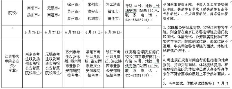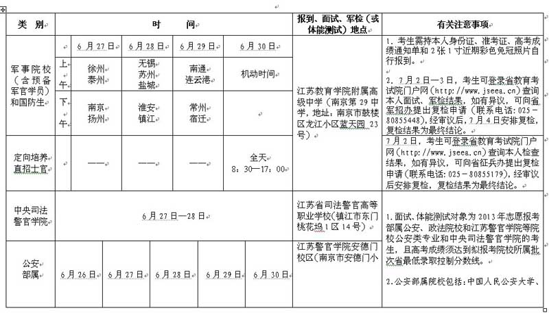 江苏省2013年军事、公安、司法院校(含直招士官)面试、军检或体能测试安排