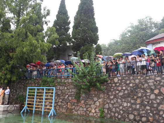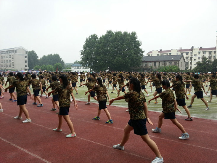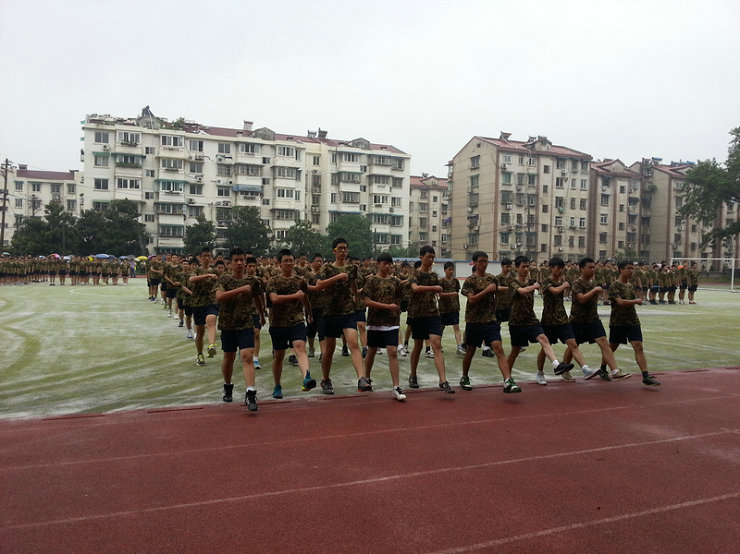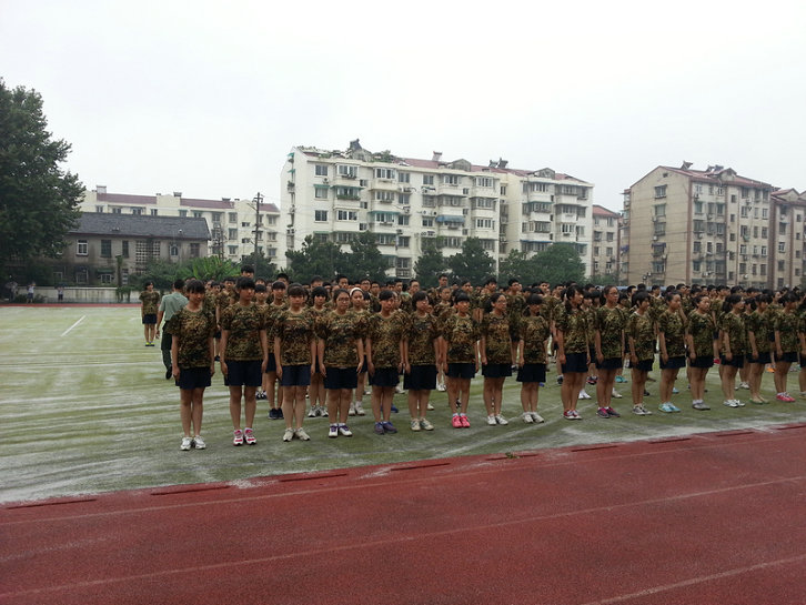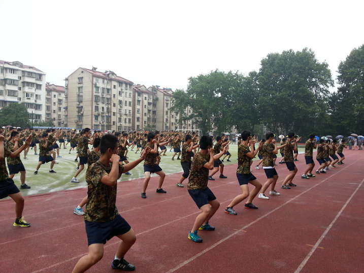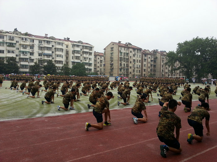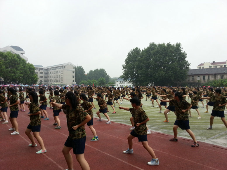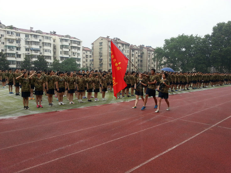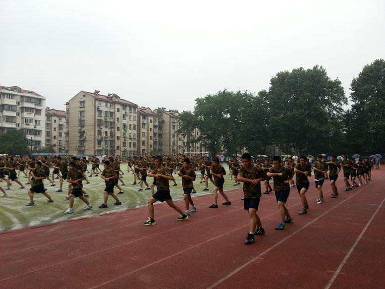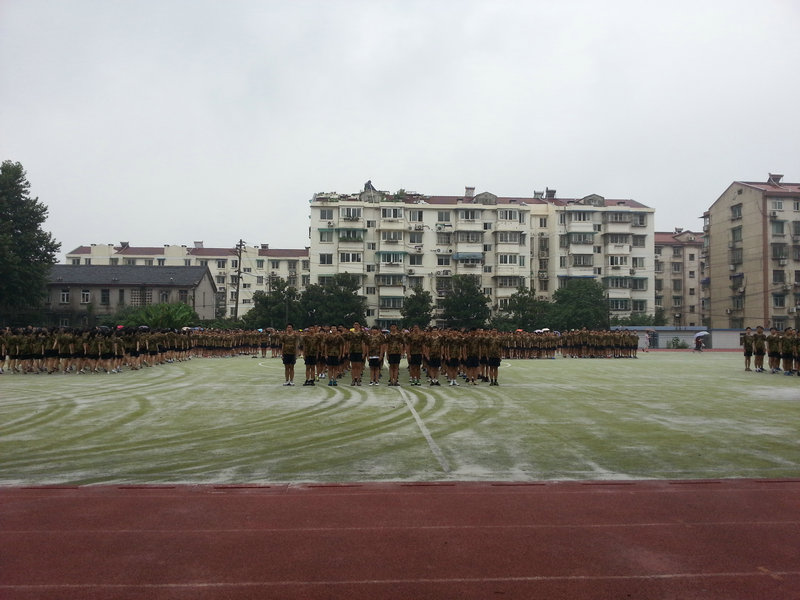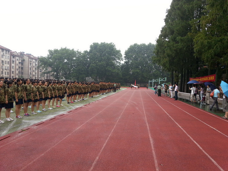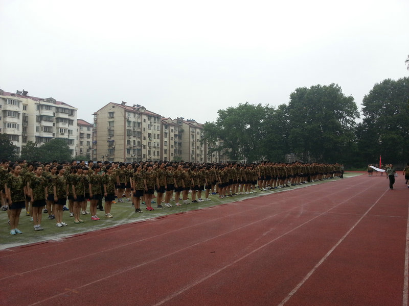 2013年8月26日上午10:00,九中高一年级全体军训学员冒着大雨在九中震旦校区操场上进行暑期军训成果汇报表演,为十天的军训生活划上了一个圆满的句号。九中张恒柱校长,林启红书记,周易宏副校长,诸谦副校长,高晓俊副校长,南京炮院的领导和各连队教官,以及高一各班的班主任老师参加了检阅。在一个多小时的时间里,他们陪着学生们一起站在雨中,直到汇报表演结束。阅兵式、分列式