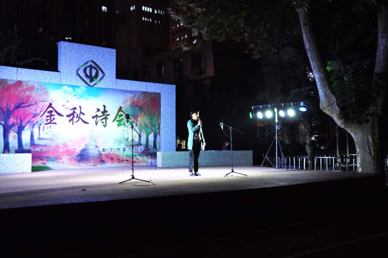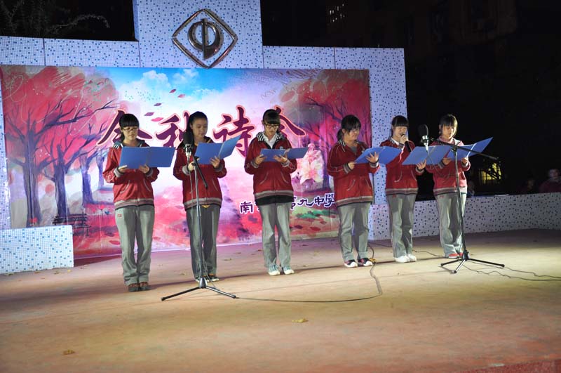 10月18日晚18:20分,在校德育处和高一年级部的精心组织下,在高一各班班主任的大力支持和同学们的精心准备下,2013年九中校园文化艺术月活动之金秋诗会在校田径场成功举办。张恒柱校长,林启红书记,诸谦副校长和在场的师生一起观看了比赛的全过程。秋夜诵诗,情浓意更浓,舞台上灯光闪烁,高一年级十七个班的同学们为在场的评委老师和观众献上了一首又一首动人的诗篇。经过在场评委老师的认真评议,各班获奖情况如下:
