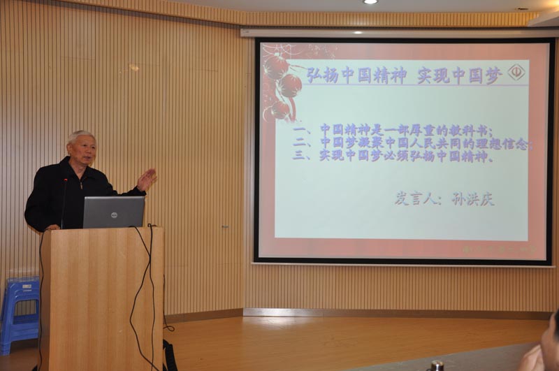 2013年10月21日中午12:30,高二年级(12)和(13)班两个班级的同学利用中午时间,听了一场别开生面的关于“弘扬中国精神·实现中国梦”的报告。报告是由南京市教育局原副书记兼延安精神研究会副会长孙洪庆会长所做,诸谦副校长出席了报告会。报告会上,首先陈光主任向同学们介绍了孙会长的情况和他所研究的内容,这引起了同学们的极大兴趣。然后,孙会长从延安精神谈起,向同学们详细介绍了延安精神的光荣传统,进而鼓励同学们实现中国梦,弘扬中国精神。在这一堂课的报告会上,同学们为孙会长的演讲所感动,受益匪浅,同时也对实现中国梦有了更深的理解!