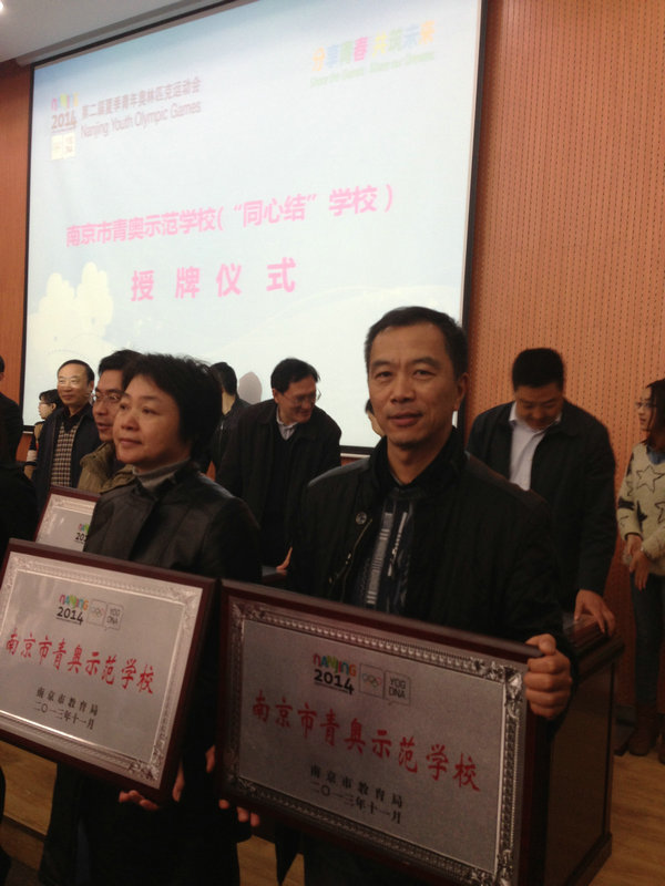 上周五(2013年11月15日),在中华中学举办的“南京市青奥示范校”授牌仪式现场,我校喜获“南京市青奥示范校”称号,感谢各部门在申报工作中的辛勤付出。
