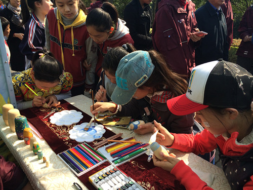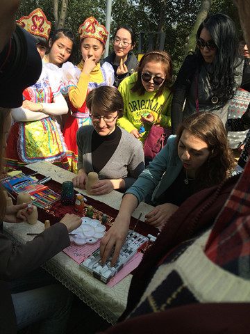 除了精致的小屋内饰,南京九中的同学们还准备了很多富有俄罗斯文化特色的互动游戏。在门口的展览桌上,同学们摆上了一溜排的原木套娃和各种颜色的水粉颜料,感兴趣的市民可以拿起颜料,按照自己的喜好为套娃们上色。南京九中的同学们邀请来了南京大学和南京农业大学的俄罗斯留学生们,他们的出现吸引了很多市民的目光,大家都说南京九中的小屋是名副其实的俄罗斯小屋。在小屋旁边的空地上,则准备了俄罗斯歌舞供市民们观看。同学们穿起了俄罗斯的传统服装,唱起了俄罗斯歌谣,跳起了欢快的舞蹈,他们还会热情地邀请市民们一起跳起来。现场欢声笑语,热闹非凡。细心的小屋设计者们还专门给外国朋友设计了一个节目,那就是现场学写毛笔字。由九中擅长写毛笔字的同学主持,现场给外国朋友教授如何握笔,如何起笔,如何落笔等。不少路过的外国朋友驻足观看,认真学习之后,留下了“墨宝”。精彩的活动吸引了市民们的围观,小屋人气超高。