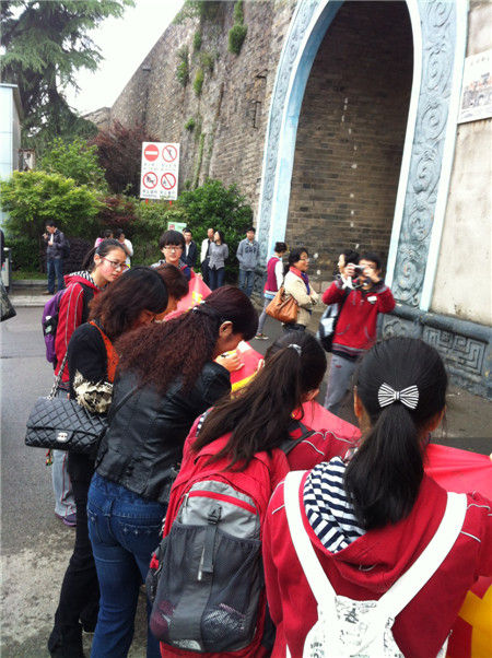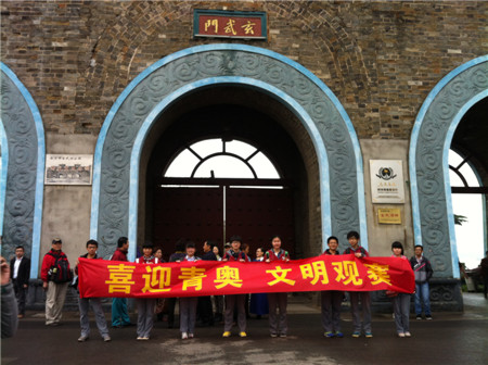 2014年4月27上午,南京九中高一(6)班的十位志愿者在玄武门开展了“喜迎青奥,文明观赛”的宣传活动。