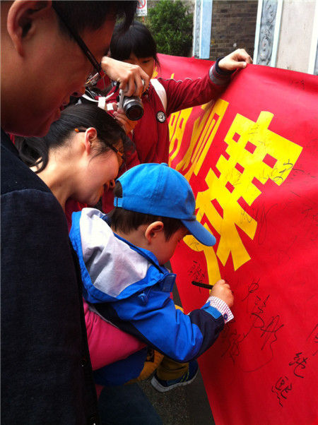 上午的春风虽不能给我们带来温暖,但人们的热情已经深深地感染了我们。我们展开了宣传横幅,最初只有几个人签上了名,但前来签名的人都很热情,都表示会将此宣传下去并邀请更多的人前来签名,承诺文明观赛。不少人前来拍照留影,更有父亲抱着孩子,让孩子签上了名……一传十,十传百,我相信这一文明观赛的思想一定能够给人们以很深的印象。