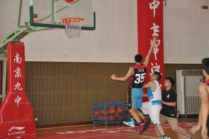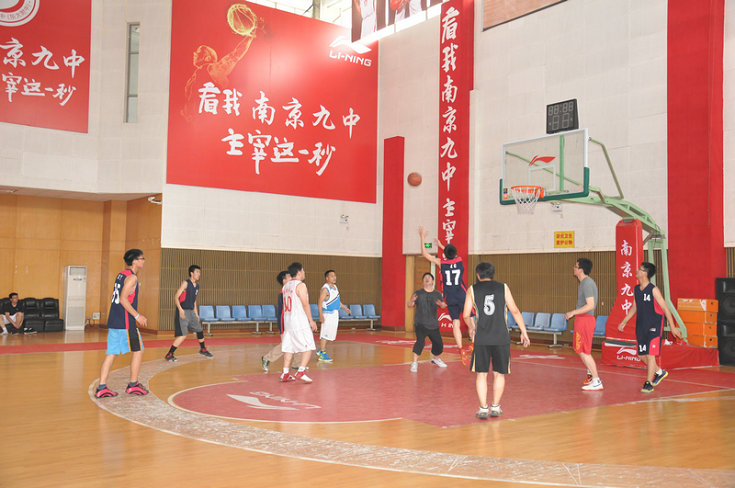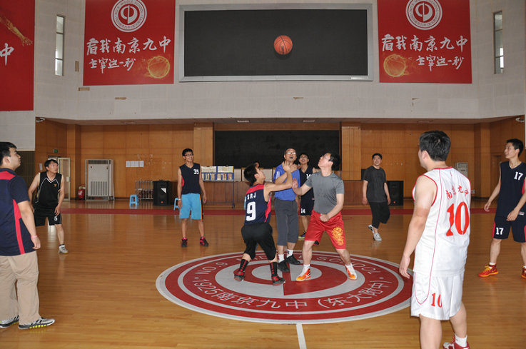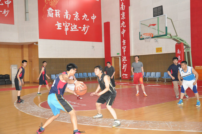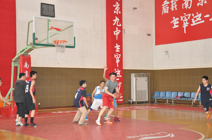 5月29日周四中午12:20,在九中体育馆举行了一场别开生面的篮球友谊赛,对阵的双方是由九中教师组成的教工篮球队和刚刚获得九中2013~2014学年弘光杯冠军的高一(11)班篮球队,随着本场裁判高骁俊副校长的一声哨响,比赛正式开始。高一(11)班篮球队先声夺人,利用快攻取得开门红,当然教工队也不甘示弱,由吴昊老师三分还以颜色。比赛进行的异常激烈,11班的蔡宜正同学不愧是本班的MVP,不断利用自己娴熟的技巧为本队取分,而教工队则依靠经验和配合,李立祥老师、封平强老师、范铁铭老师、马剑老师、薛晓东老师、张佩林老师和阚全兴老师,轮番上阵,多点开花,始终保持着比分的领先,并最终以41:37取得了胜利,比赛结束后,老师和同学们都沉浸在运动和比赛所带来的快乐之中。