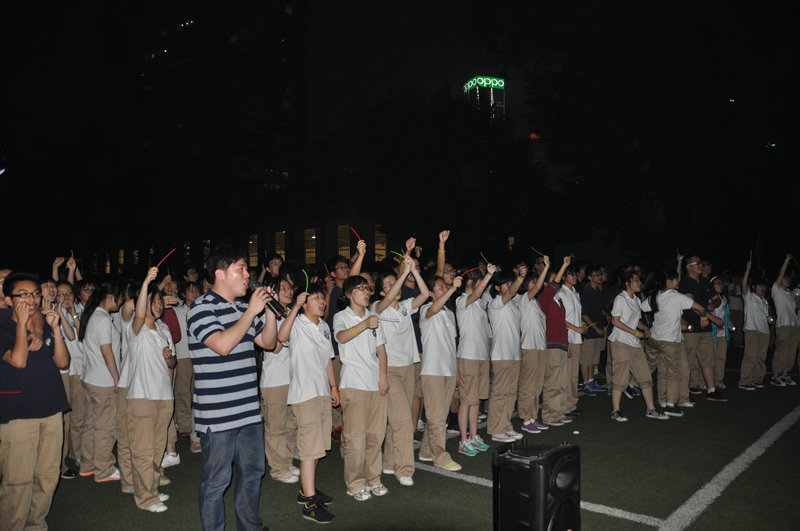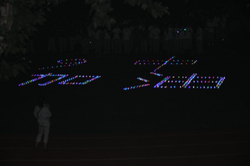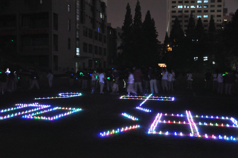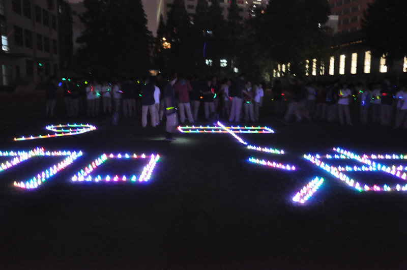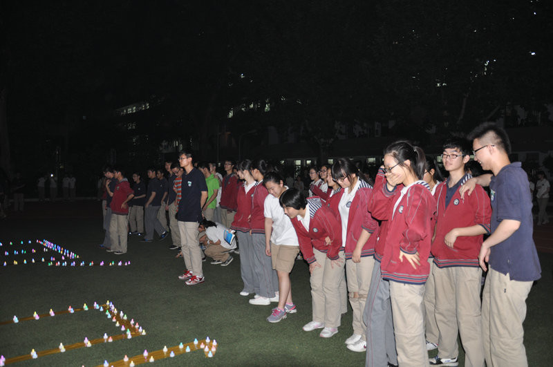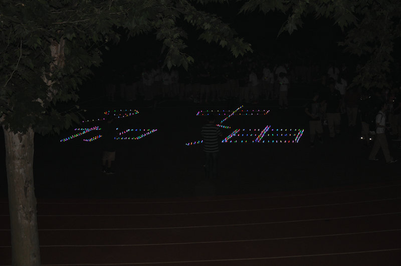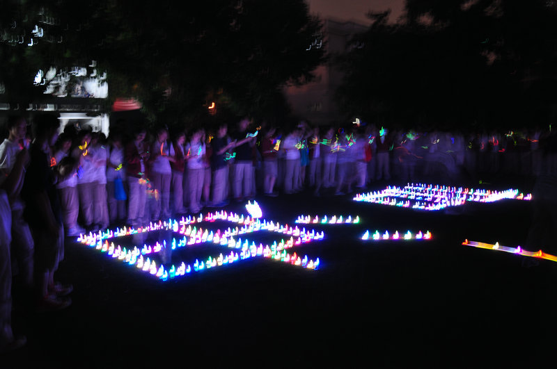 20:45分,九中电台的音乐声响起,操场上出现了由荧光棒和电子蜡烛组成的“九中加油”四个大字,在夜幕下显得格外的浪漫和温馨。炫丽七彩的烛光,闪烁的是对明天的祝福;五颜六色的荧光棒,挥舞的是未来的期待;“九中加油,高三加油!九中加油,高三必胜!”一声高过一声的呐喊,是同学们对九中的信任与热爱!