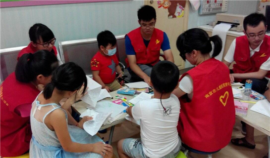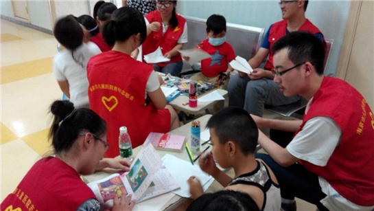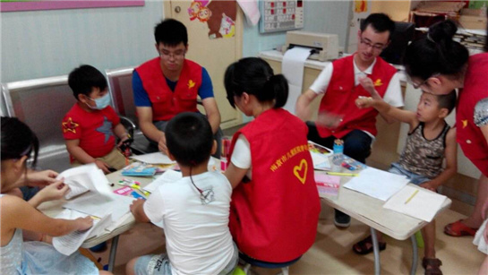 而与此同时,南京九中的另一批志愿者们,来到了儿童医院住院部某科病房区,教那里的孩子们画画,写字,与他们一起讨论喜欢的动画片。在志愿者们的共同努力下,孩子们放下了一开始的胆怯,整个活动中充满了欢声笑语。而志愿者也在这一系列的活动中升华了自身,我相信在不久的将来,在他们步入大学的校园中的时候,他们将变得更加成熟。