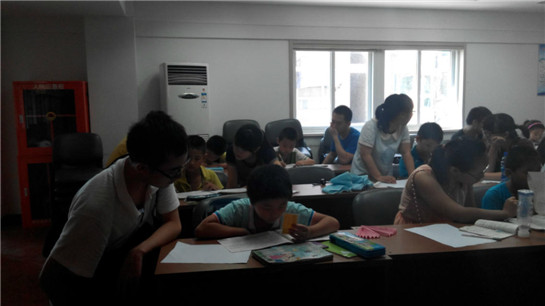 2014年7月23日下午2:00,来自九中的高三毕业班的几位志愿者来到了位于鼓楼区幕府西路101号象山社区居委会的“象山社区希望来吧暑期夏令营”开始了他们的志愿活动。同学们提前半个小时来到了社区,将桌椅摆好擦拭,烧好开水,开好空调降低室温。不一会儿,他们的服务对象,18位来自社区的孩子们便蹦蹦跳跳的来了,同学们先给孩子们辅导了功课,随着一道道难题的解开,那些孩子对陪伴自己的志愿者表达了无限的羡慕与敬佩之情。之后,志愿者们又给孩子们展示了许多他们旅游所拍回来的照片,九寨沟、巴厘岛、云南等等,引起了孩子们的极大兴趣,在给这些外来工的孩子看各种大千世界的同时,志愿者们也跟自己陪伴的孩子开始做心灵上的交流,给他们讲述生活中有哪些正能量的事物。