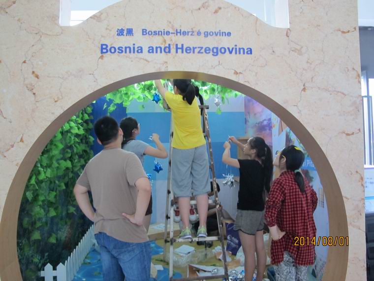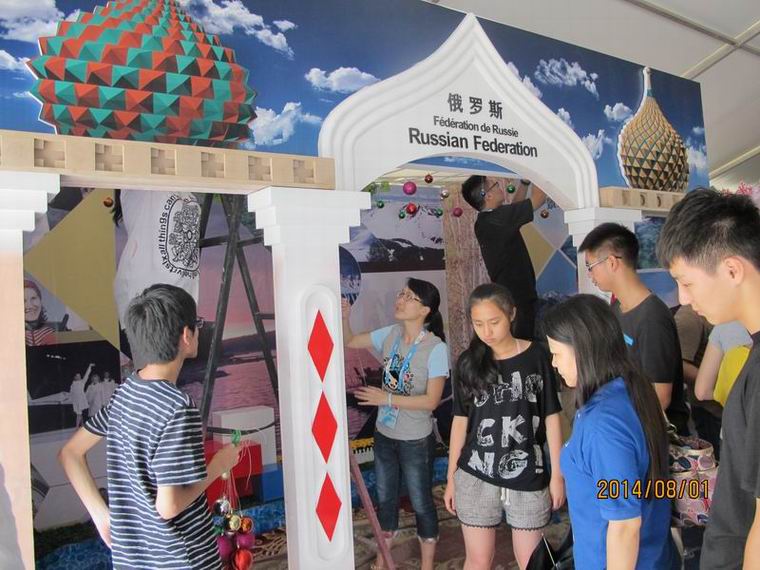 2014年8月1日上午,南京市第九中学的青奥文化教育代表们满怀热情来到世界文化村。同学们来到青奥村,不禁被青奥村的现代化与美丽深深吸引,但是很快他们就全身心投入了俄罗斯和波黑两个小屋的搭建工作。