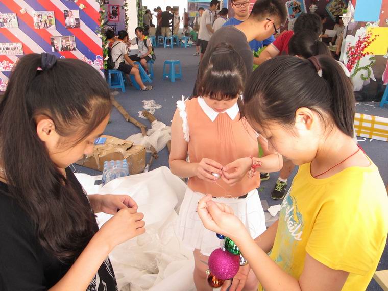 在九中团委李净、袁曦、李菊平和王艳飞几位老师的指挥和安排下,同学们齐心协力地从车上把材料搬运到场馆,大家不辞辛苦地一趟趟往返于青奥村门口和小屋之间,直到所有物品都搬送到位。在随后的小屋搭建工程中,同学们遇到了很多困难。原来理顺的绳子都乱成了一团,从网上购买的地毯比小屋的尺寸大,原订的门柱比预想的矮……面对这些现场出现的问题,同学们没有抱怨,而是凑在一起积极协商。最终,在同学们团结协作之下,这些问题都一一得到了完美解决。大家分工明确,有条不紊地装饰俄罗斯小屋顶部,有的负责整理丝线,有的负责串球,有的则专门悬挂,形成一条流水线;大家积极思考,在波黑小屋门头因桥柱上长下短影响参观时同学想到拆东墙补西墙的妙招,同时也弥补了俄罗斯小屋门头下端过短的问题;地毯过长没问题,折起一端,把花纹露出来效果也很好……在一片欢声笑语中,南京九中负责的俄罗斯小屋和波斯小屋顺利搭建完成。