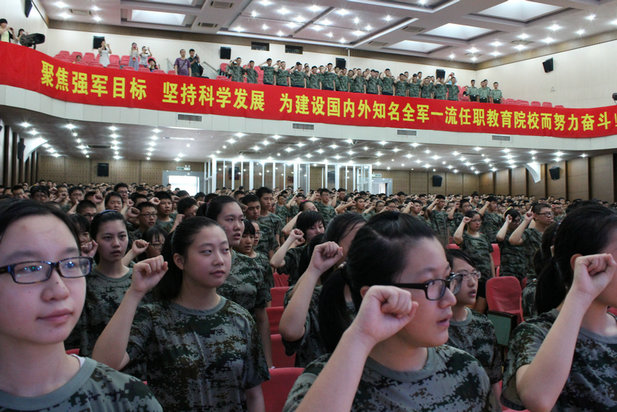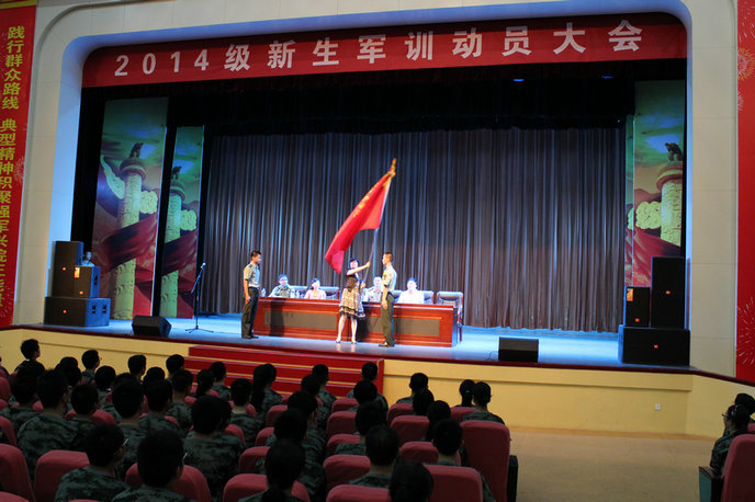 上午9:30到达汤山炮院后,同学们放下行李,换上统一的军训服装,在教官统一指挥下,整队来到大会堂,参加了2014级新生军训动员大会并举行了宣誓仪式。会上,汤山炮院的领导和教官代表向在座的九中学子们提出了三点要求:不怕吃苦,服从命令,紧密团结。九中诸谦副校长也对同学们提出了殷切的希望,当嘹亮的中国人民解放军军歌响起,当诸校长从教官手中接过军训大旗,九中2014级高一新生军训活动就正式拉开帷幕。孩子们的掌声雷动,喊声嘹亮坚定,从穿上军训服的那一刻起脸上的激动与兴奋就不曾离去,因为它象征着一种使命,象征着一种精神。