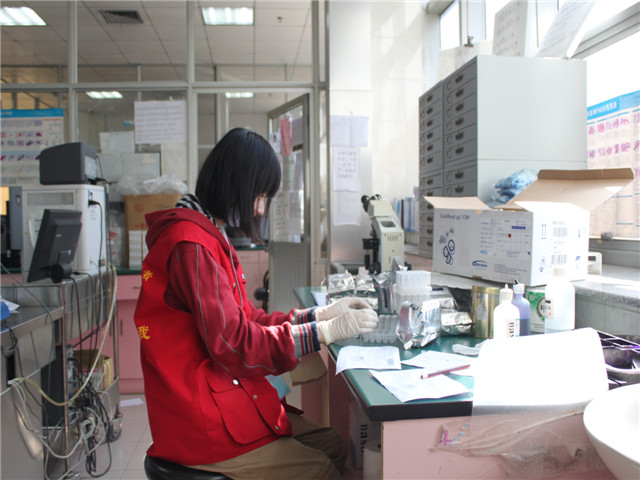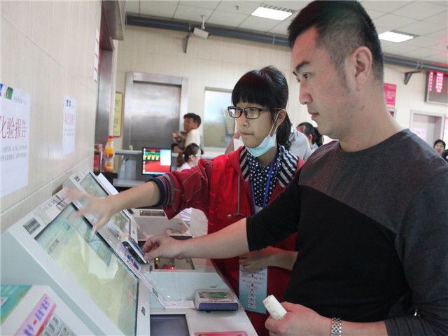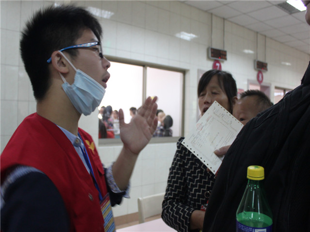 在儿童医院的志愿者之家,志愿者们接受了院方老师的专业培训。了解各岗位的服务内容,换上漂亮的红马甲,戴上专用的工作牌,十位同学热情高涨的上岗工作。负责自助设备的同学热情帮助每一位病人家属完成读卡,打单等一系列操作。在一站式服务台的同学,纵然是卖一元一本的病历,也工作认真毫不马虎。还有被分配到了化验室的同学,在完成志愿者活动的同时,着实体验了一次当白衣天使的感觉。每完成一次服务,解决了家长的问题,同学们脸上都会露出幸福的微笑。