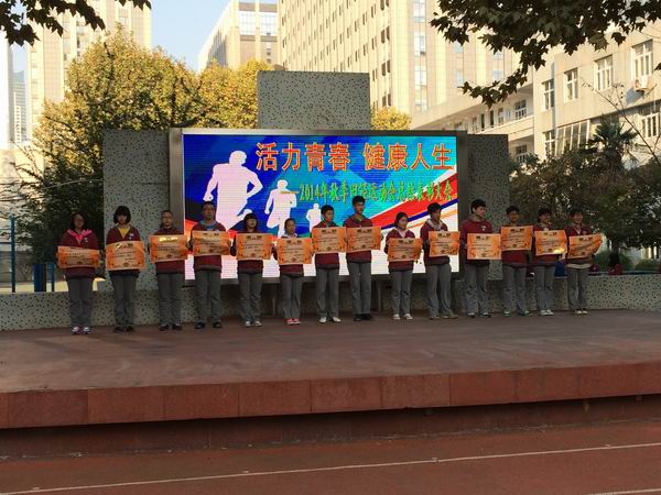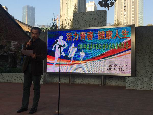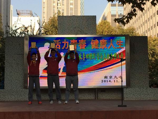 11月4日上午,南京九中在大操场召开了2014-2015学年秋季田径运动会总结表彰大会。此次表彰大会由南京九中高骁俊副校长主持。他总结了此次运动会,宣读了在此次运动会上获总分团体奖、运动会入场式表演奖以及“精神文明班级”称号的班级名单。运动会上,高二5班的宋天立、高三3班的池浩强、高三11班的鹿子杰表现突出,在实心球项目中打破校级纪录。随后,南京九中张恒柱校长、党总支林啟红书记、诸谦副校长、周易宏副校长为获奖班级代表以及破纪录的学生颁奖。