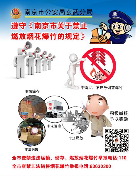 请广大市民自觉遵守《南京市关于禁止燃放烟花爆竹的规定》和本通告有关规定,不购买、不燃放烟花爆竹。积极举报非法销售、储存、运输和燃放烟花爆竹的行为,对举报查实的予以奖励。