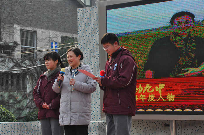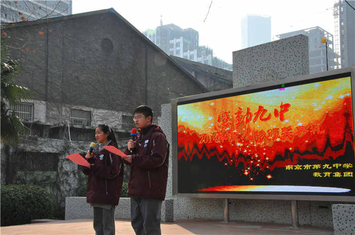 南京市第九中学教育集团“感动九中”年度人物评选活动是学校力推的传统德育项目。在面向全校师生收集九中的感动瞬间、感动事迹的基础上,由所有在校学生为“感动九中”人物候选人投票,选出年度人物。在颁奖典礼上,由提名的同学为感动人物宣读颁奖词,为深深感动自己的老师、同学和家长颁奖,并与获奖者进行现场交流。同学们情真意切的真情流露,让九中新学期的第一天充满感恩与温情。在2014感动九中年度人物的获奖者中,有三十多年如一日坚守讲台,一心扑在教书育人事业的吴艺文老师,有负责校园用电安全,兢兢业业默默奉献的陈相超老师,有阳光向上、踏实稳重、热心班级管理的优秀高中生洪京晶同学,有为国内中学生篮坛屡建战功的九中篮球队;有为回报母校出资建立九中震旦基金会的年轻的发起者们;有服务青奥,奉献南京城市建设的的九中青奥志愿者服务队。这些在平凡的工作岗位上不计得失、默默奉献的九中人,为了实现大家的九中梦付出自己的青春和热情,他们是九中历史上值得铭记的一群人。