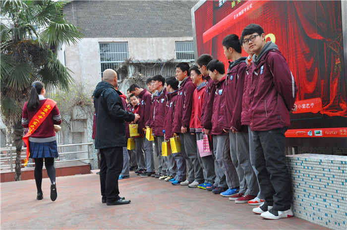 开学典礼的第二篇章是寄语篇。在开学典礼的会场上,滚动播出着各班班主任对班级学生的新学期寄语。“希望同学们能用自律来规范自己的言行,用礼节来展示自己的风采,用知识与智慧来铺就自己的美好前程”、“求真务实,精益求精”、“希望大家能在羊年多读书,勤思考,‘羊’出生气、勇气、志气,收获灵气、喜气、福气”……一条条热情洋溢的寄语寄托着班主任们对同学的新学期期望,在冬日里温暖了同学们的心灵,瞬间点燃了同学们的斗志。获得“感动九中”2014年年度人物的教职员工和同学们为大家抽取了幸运同学,赠送新学期大礼包。精美的笔记本、造型独特的文具……这个礼包成为了获得此份幸运的同学们最佳的新学期礼物。