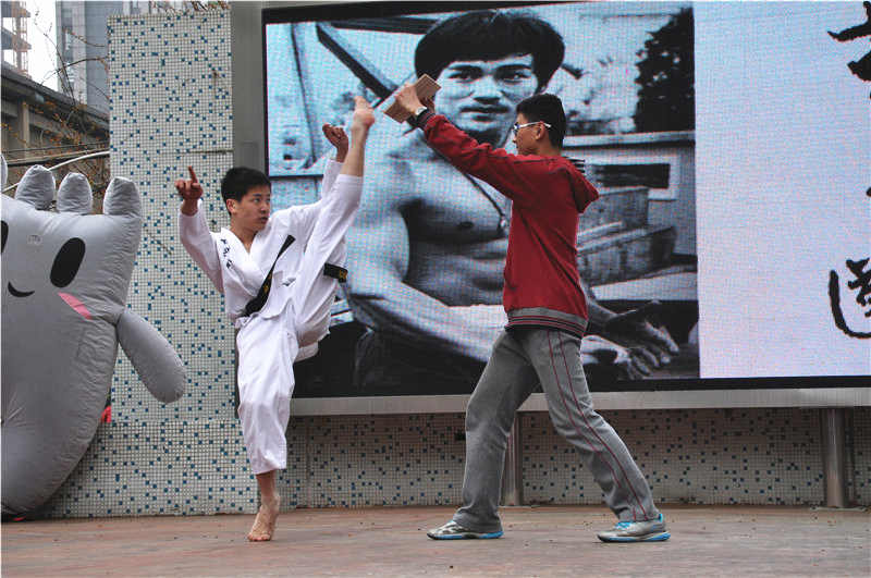 我中华泱泱大国,有着上下五千多年的悠久历史及文化遗产,而其中中华武术更是博大精深,它可是由我们中华儿女、炎黄子孙们用智慧和汗水凝聚而成的一座“万里长城”。截拳道社的同学们穿着道服耍着双截棍,劈着木板,惊得台下同学都长大了嘴。