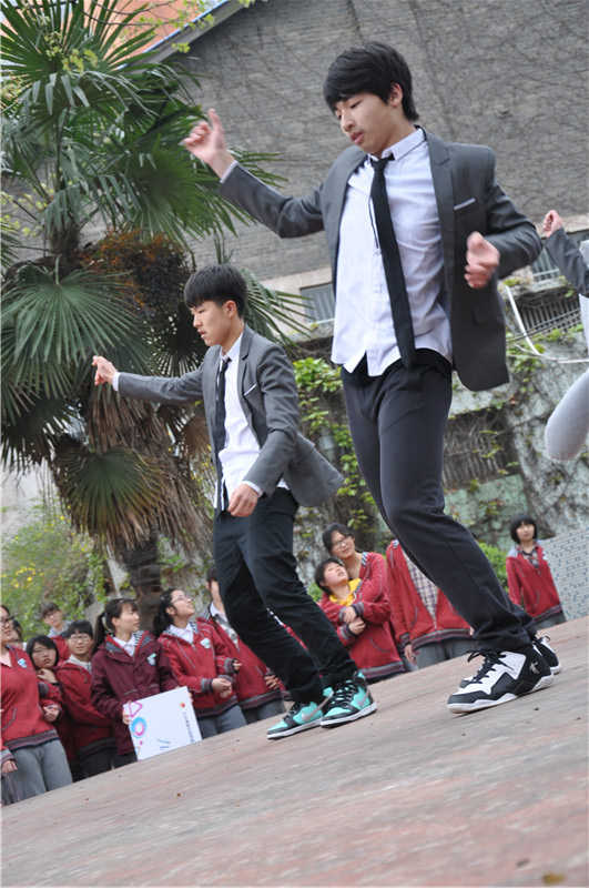 像海面上一轮冉冉升起的旭日,像深林中一只疾走惊跃的头鹿,队长用灵活的四肢甚至是五官,娴熟自由地舞动着自己,舞动着青春.像一群活泼的精灵,他们活蹦乱跳在舞台的中央.忽而全身惊颤,触电般急骤;忽而一阵蠕动,龙蛇般柔韧;忽而倒立旋转,陀螺般迅猛;忽而挺身屹立,像参天松一般的笔直。掀起了台下一阵阵尖叫,在风中卷起了热浪。
