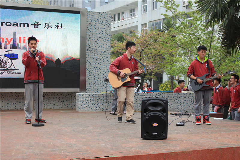 只听得电吉他狂野的音乐声响起,音乐社的“”的演唱开始了。架子鼓、贝斯、电吉他、电子琴和主唱的完美配合,造就了一场音乐的盛宴。虽然硬件设配不是最好的,但热爱音乐的心是火热的。
