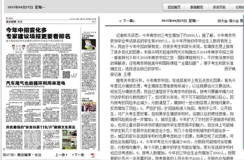 记者昨天获悉,今年南京初三考生增加了约2000人。据了解,今年南京市参加学业考试报名的学生有47857人,从今年开始初中毕业生人数将有所上升。而由于今年中招政策有变,对很多考生和家长来说,在填报志愿上就有了很多变化的因素。本报从明天起连续两天分别推出《2015年南京中招之变·普高特刊》和《2015年南京中招之变·国际课程特刊》,不仅有深度中招政策解读,还有南京特色高中和国际课程“全面扫描”,便于考生和家长准确定位,选择适合自己的学校。
