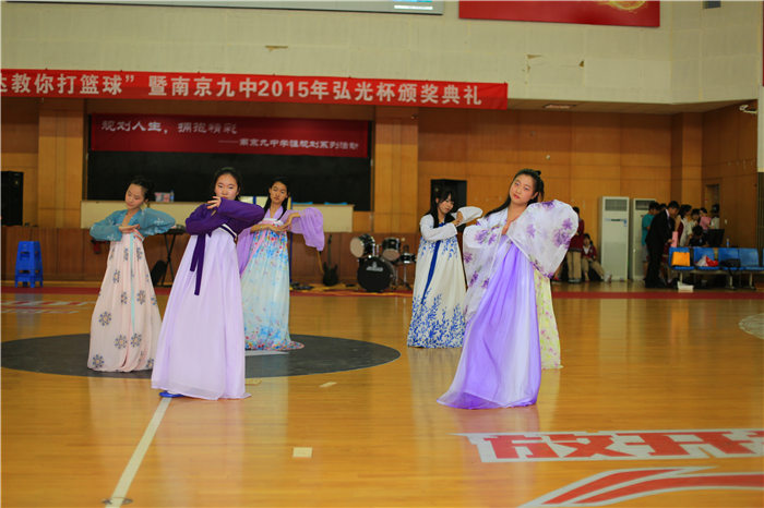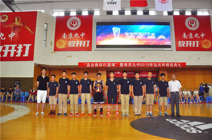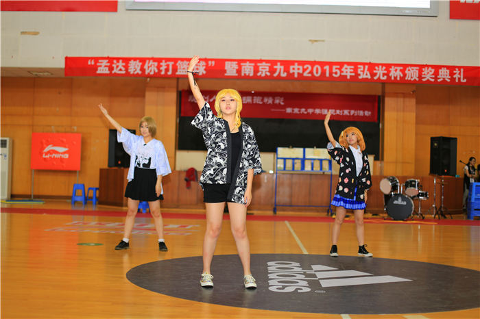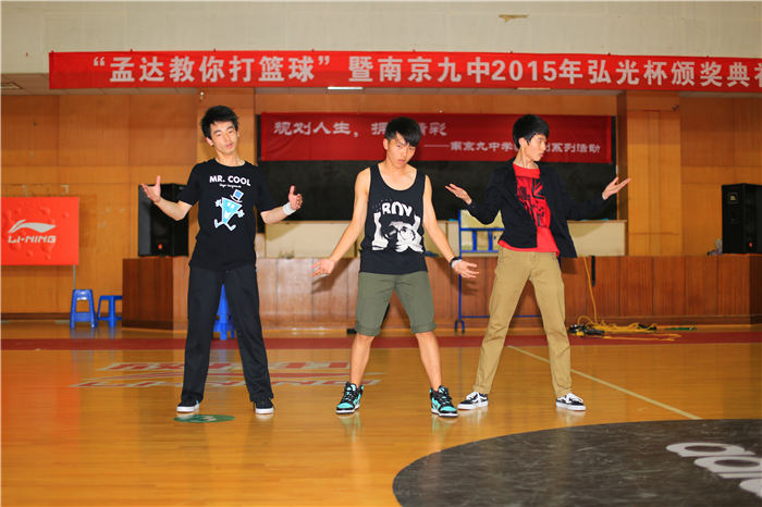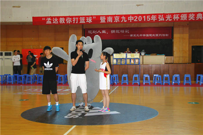 本次活动包括三部分:一是“孟达教你打篮球”暨南京九中2015年弘光杯颁奖典礼;在这个活动中,南京九中特别邀请了九中著名校友之一,CBA篮球运动员,现效力于江苏南钢篮球俱乐部的孟达来到现场。孟达超高的人气吸引了大批初三学子的关注,大家早早地来到体育馆,等候着活动的开始。同时,大批专为比赛设计的“孟达系列”纪念品,如明信片、海报、小旗子、充气棒等也成为了场上关注的焦点。在同学们的期待中,第一部分活动拉开了帷幕,孟达亲自上阵,现场教同学们如何运球,如何转身投篮等,还童心未泯地跟大家一起玩起了“母鸡搬家”“天璇神射”等趣味游戏,活动过程中不时地引得在场观众们的阵阵掌声和呐喊。在之后举行的对抗赛中,南京九中还特别邀请了九中著名校友之一、国际级裁判袁宁鹏担任执法工作,为此次活动增加了可看性,紧张激烈的比赛氛围充分吸引和感染了现场每一位同学,同时也将此次活动推向了高潮。