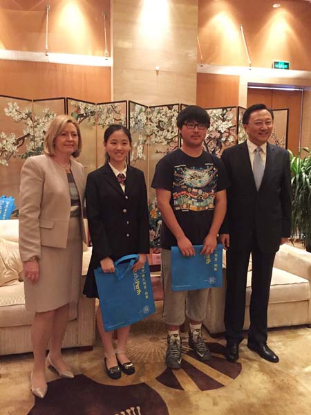 6月19日下午,南京市第九中学得许乐夷、张钟元、刘骏熠三名同学来到南京威斯汀大酒店,参加“我和珀斯合个影”活动项目颁奖和启动仪式。澳大利亚珀斯市市长丽莎•斯嘉菲迪带领珀斯市教育城以及西澳大学代表一行参加了仪式,南京市市长缪瑞林先生亲切致辞。