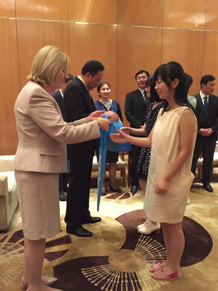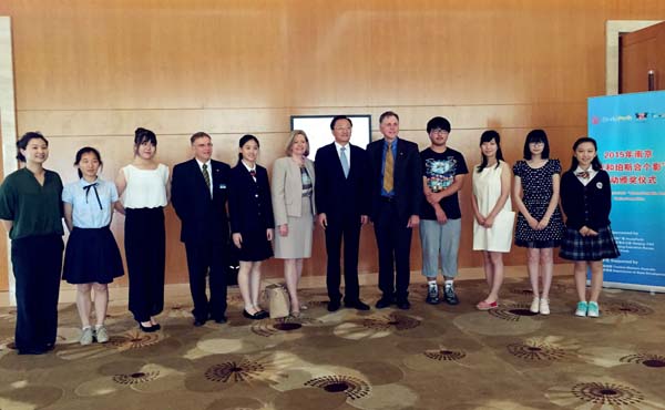 双方市长和来自于南京市第九中学、南京外国语学校等学校的获奖学生合影留念。8月份,他们将正式参加到两国的友好交流活动中。