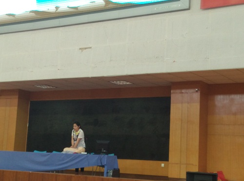 培训内容分为救护理论和实践操作两部分。理论培训课在体育馆二楼举行,授课老师在介绍应急救护的概念、必要性、人体基本知识等有关救护背景资料后,用通俗易懂的语言向学生们讲解了一些日常突发意外状况的处置,着重讲解了心肺复苏术以及止血、包扎、搬运、固定四项基本救护方法,通过案例剖析、图示讲解、现场演示等各种形式将急救理论知识传授给学生。