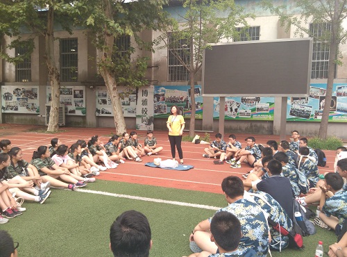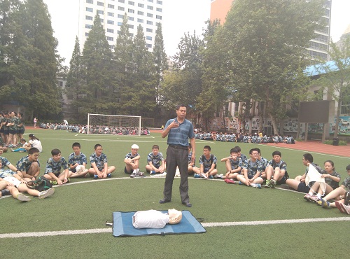 实践操作课在操场上举行,每名老师负责教导一个班级。通过老师手把手的传教,进一步加深了同学们对心肺复苏以及四项基本救护方法的理解,提高了同学们的动手操作能力。每位学生都要当着老师的面实际操作心肺复苏、止血包扎等急救措施,直到熟练掌握为止。