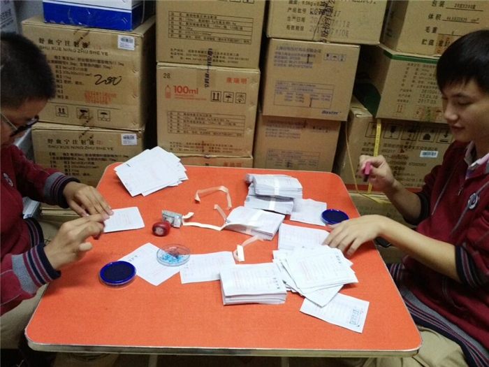 王高森同学的服务地点是药房,他看到有的医生在加药,有的负责盖章,有的导医……各自忙碌,都很愉快的工作着,他也迅速加入了盖章的队伍。盖章看起来简单,其实挺不容易,经常会盖不上去,所以他始终用心地去工作。