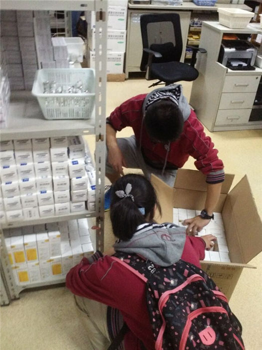 孙斌同学负责在医药部分药,接到分药任务后他收敛情绪,仔细分药,医生告诉他分药时要看批号,将批号早的放在前面,所以在放置的时候,他格外仔细,目不转睛。 接触到社会的生活他感到非常开心。