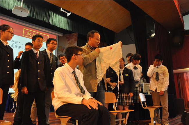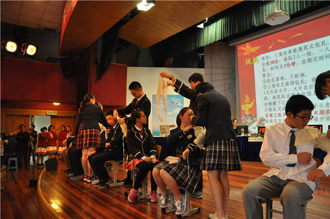 据组委会介绍,此次比赛是为了进一步推动校园国防教育普及深入,增强中学生的国防观念和国家安全意识。除了一些国防军事常识之外,军歌接唱和红十字救护的操作题是现场的亮点。红十字救护题是2015年比赛新增的内容,是为了增强中学生安全防护意识,提高突发情况下的自救互救能力。在比赛现场,6支队伍的选手们面对组委会给出的题目“三角巾单肩燕尾式包扎”犯了难,包扎过程颇费了一番功夫。南京市红十字会赈济救护部部长徐宏点评了此项环节的比赛,并且给在场的同学们详细讲解,亲自演练了规范的“三角巾单肩燕尾式包扎”。