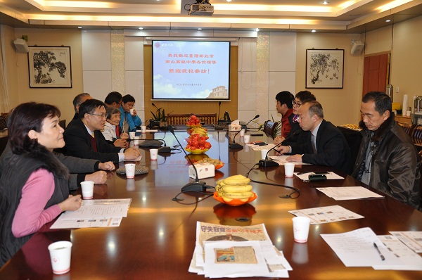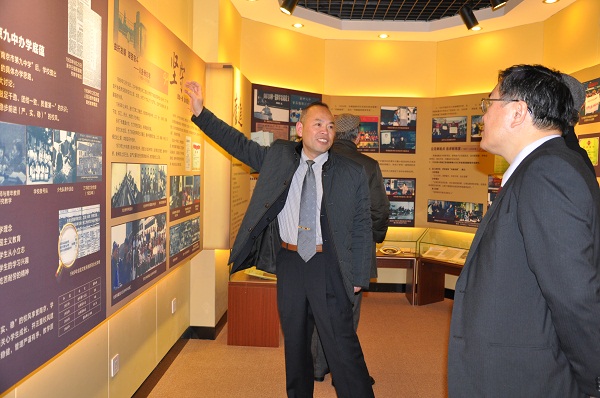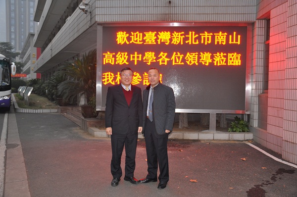 首先,九中校长张恒柱致欢迎词并介绍了学校的自然状况和体艺特色。张校长追溯了九中和南山中学交往的历史,两校早在二十年前就播下友谊的种子。在此期间,两校都有往来,特别是通过篮球为桥梁的互访。接着,南山高级中学的蔡校长详细介绍了学校的基本情况、办学特色、体育特色发展。鉴于两校有很多共同之处,蔡校长提议两校签署友好往来协议,从而进一步扩大文化、课程、特色等方面的交流。来自南山高级中学的王董事长盛情地邀请九中2016年10月参加南山高级中学七十周年校庆。之后,张校长带领客人们参观了学校校史馆、篮球生训练情况、民乐团的排练。在自由交流环节,两岸学校领导就学校管理、学生课业情况、高考情况进行了广泛交流。