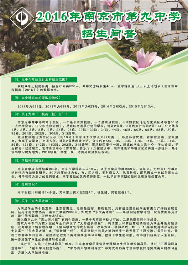 我校今年上报的新高一招生计划共630人,其中文艺特长生40人,篮球特长生6人。以上计划以《南京市中考指南(2016)》的数据为准。