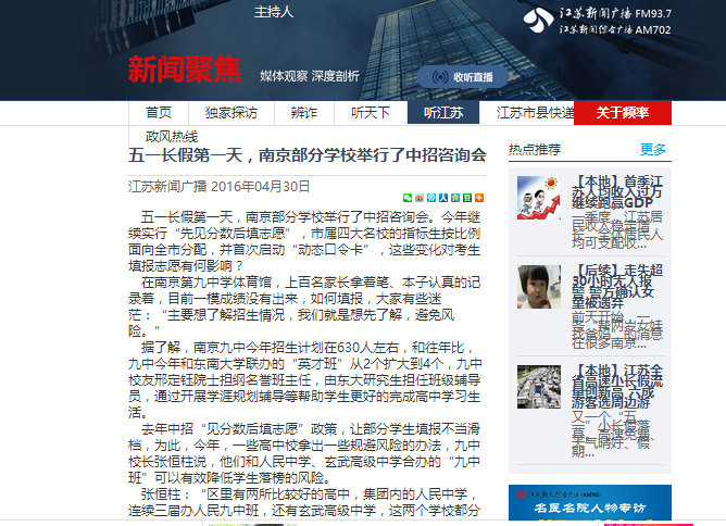 江苏新闻广播 2016年04月30日 五一长假第一天,南京部分学校举行了中招咨询会。今年继续实行“先见分数后填志愿”,市属四大名校的指标生按比例面向全市分配,并首次启动“动态口令卡”,这些变化对考生填报志愿有何影响? 在南京第九中学体育馆,上百名家长拿着笔、本子认真的记录着,目前一模成绩没有出来,如何填报,大家有些迷茫:“主要想了解招生情况,我们就是想先了解,避免风险。” 据了解,南京九中今年招生计划在630人左右,和往年比,九中今年和东南大学联办的“英才班”从2个扩大到4个,九中校友邢定钰院士担纲名誉班主任,由东大研究生担任班级辅导员,通过开展学涯规划辅导等帮助学生更好的完成高中学习生活。 去年中招“见分数后填志愿”政策,让部分学生填报不当滑档,为此,今年,一些高中校拿出一些规避风险的办法,九中校长张恒柱说,他们和人民中学、玄武高级中学合办的“九中班”可以有效降低学生落榜的风险。 张恒柱:“区里有两所比较好的高中,集团内的人民中学,连续三届办人民九中班,还有玄武高级中学,这两个学校都分别办人民九中班和玄高九中班,万一差几分,一般情况十分之内,通过师资合作保证孩子享受九中教育资源,这样万一差几分有个保障。” 从今年起,南师附中、金陵中学、第一中学、中华中学等四所市属高中的指标生计划全面向全市分配,改变了往年对“原五县”指标生只分配到区的做法。以一中为例,招生规模和去年基本持平,招生计划数在550人左右,除去特长生计划数31人,剩下的50%为指标生,50%为统招生,一中校长尤小平认为,对家长填报志愿影响不大。 尤小平:“指标生变化原来的扩大到全市,变化应该不大,去年我们统招生扩大到全市来的就很少,因为高淳溧水他们不一定愿意到我们这里来上学,这个变化很小,几乎没有。” 去年,南京首次尝试“见分填志愿”,一些学校出现了“扎堆”填报的现象,以至于部分考生与理想学校失之交臂。今年依然是“见分填志愿”、继续“零择校”,家长如何填报志愿呢? 对于去年不少高分考生滑档,错失上四星级高中,九中校长张恒柱分析:“见分填志愿对于家长和孩子来说总体是好事,如果理性选择可以很大避免风险,但带来弊端是,孩子和家长都有一个心理,我已经考了一个比较高的分数,那个学校可能和我预测的分数差不多,怕吃亏的心理,就增加了赌徒心理,我赌一下,有可能就能上,这样群体人数多了,就会人为拔高相对比较好的学校的线,导致追高落榜。” 一中校长尤小平建议,考生一定要根据自己中考分数和排名做选择,不要太冒进。 尤小平:“中考成绩公布的时候也公布你的中考名次,到时候大概定出什么学校来,家长呢也不要冒太大的风险,相对保守一点。” 张恒柱建议家长可以给孩子做个分层“体检”,志愿填报拉开档次: “首先定位好,分析给孩子找好定位,发挥最好上什么学校,发挥正常上什么学校,发挥不好上什么类型学校,在最后选择时,都要比自己正常对外预估的线稍微高一点那个层面那风险就小了,不要有赌博心理,现在毫无保障。我更有利的空间不在于踩线进去,而在于相对大多数,中等附近的孩子最受益的孩子,觉得报学校,认这个学校的平均分,恰恰对孩子最好,相对而言风险非常小,家长这么选择。” 今年中招还有一个变化,首次启动“动态口令卡”,考生信息只有学生自己知道,学校无法过问。对于这一变化,张恒柱认为,有利有弊:“动态口令卡,最大动因是防止孩子填报志愿的时候受到其他人的干扰,孩子报哪所学校完全孩子自愿,但弊端在于,所有人在填报期间没法掌握实际填报情况,想引导孩子稍微注意事项,预防风险的机制就没有了, 一方面孩子填报学校的权益得到充分保障,另一方面孩子和家长填报志愿要更加注意防范风险,不然反而会加剧风险。” 【江苏新闻广播 (南京FM93.7)沈阳】