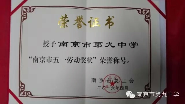 五一前夕,市总工会传来喜讯,我校因高考成绩特别突出,而被市总工会嘉奖,荣获“南京市五一劳动奖状”。据悉,此次受表彰的单位全市各系统共二十家,其中教育系统两家,一个是芳草园小学,另一个就是九中。近几年南京九中因发展很快、教育教学质量连年大幅度提高而备受社会瞩目。2015年高考更是引起轰动,文化二本达线人数突破400人大关,达429人,超市指标95人,成为南京城区唯一获得市“突出贡献奖”殊荣的学校,在社会上引起很大反响。正如南京市总工会副主席刘方宁所言,市总工会此次专门颁发五一劳动奖状给九中,就是表彰九中在南京市教育教学方面所做的重大贡献。九中人将以此为契机,众志成城,奋力拼搏,努力实现九中梦,为南京教育作出更大的贡献。
