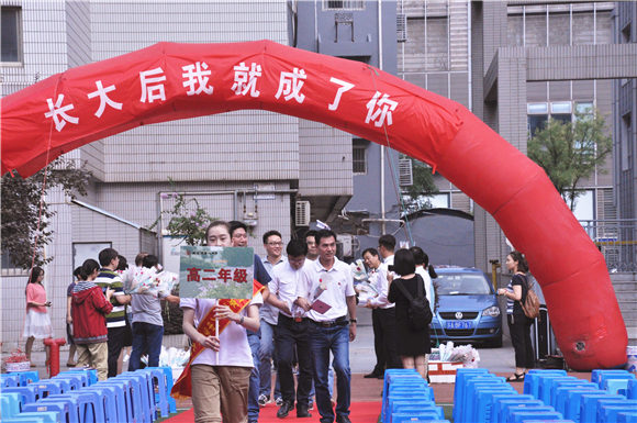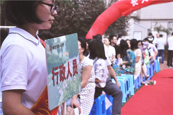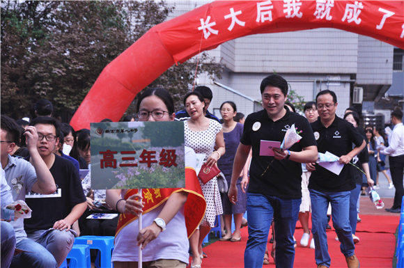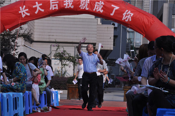 教师是默默付出的辛勤园丁,而今天,他们是红地毯上当之无愧的耀眼明星。伴随着音乐,高一高二高三的老师们分别通过红地毯,随后是行政老师组成的方阵。最后,校领导们在全校师生的热烈掌声中步入红毯。