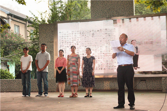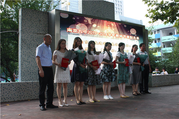 接下来,由第九中学副校长邵长峰老师、校长助理张翼飞老师、校长助理王艳飞老师分别宣读市、区、校级荣誉的教师表彰名单,校长张恒柱老师、副校长樊晓鸣老师、校长助理桑小兵老师等为获奖老师们颁奖。其中震旦教育基金会设立德基奖教金以表彰优秀教师,由南京市玄武区震旦教育发展基金会秘书徐斌先生和德基集团江苏富通置业有限公司副总经理林捷先生颁发。