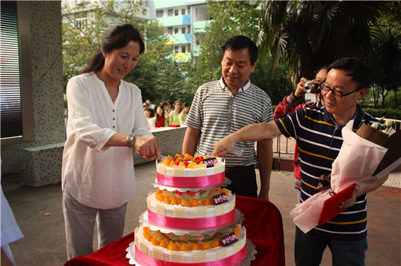 【从教三十年教师代表和校长一同切开蛋糕】