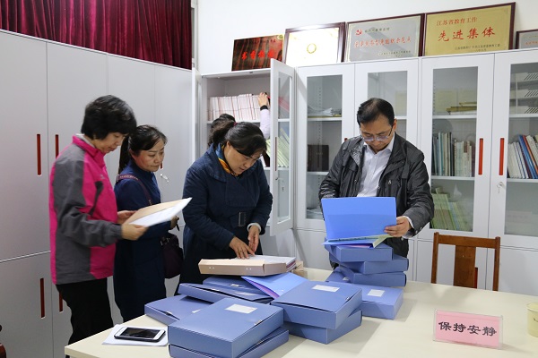11月1日下午14:30,我校综合档案室迎来了省五星级档案室复评验收,此次评审专家组有市档案局庞锡生副处长、何远鸿科长,市教育局办公室副主任潘杨华、刘芸老师;区档案局秦丽华副局长、余丹科长、韦萍老师,区教育局陈克俊副局长共8人。首先我校张恒柱校长介绍了学校基本情况,接着评审专家组听取自检报告,实地考察了校史馆和档案室,评审组认为九中档案工作基础扎实,平台高,发展快,业务精,是南京市唯一一所拥有五星级档案室的学校,在市、区教育系统中是一个品牌和亮点,最后一致认定我校通过省五星级档案室的复查验收。 我校档案室1997年通过市一级标准和省级标准认定,2001年获得国家二级档案单位认定,2007年通过江苏省五星级档案室评审,2012年通过第一次五星级档案室复评,今年是第二次复评,我们一定要以这次顺利通过复查验收为新的开端,做到巩固发扬成绩,纠正不足之处,在争创一流档案管理工作上狠下功夫,努力在档案现代化管理上探索新路子,做出新成绩。