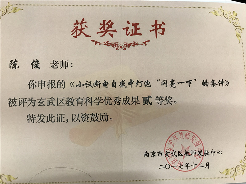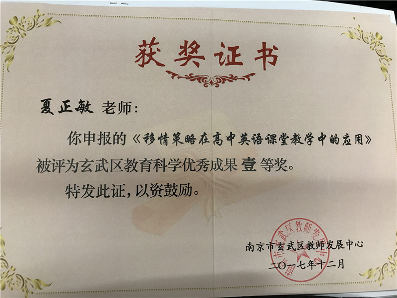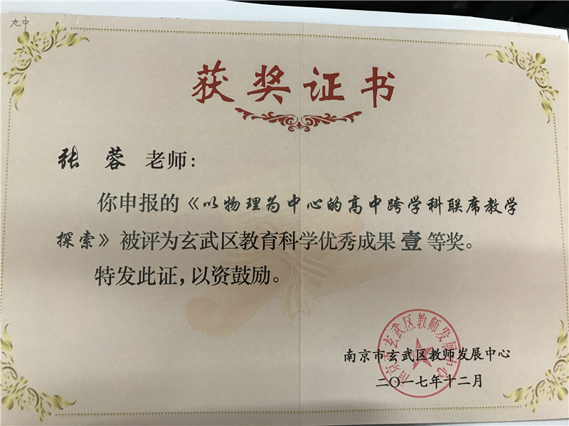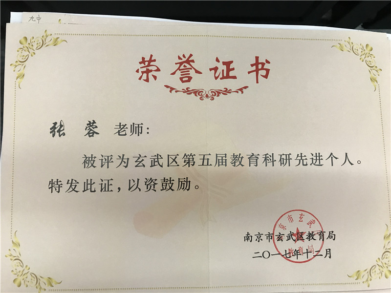 “玄武区第五届教育科研先进集体”。同时,我校的张德举、张蓉、李虎山三位老师荣获“玄武区第五届教育科研先进个人”;张蓉、夏正敏老师获得“玄武区教育科学优秀成果”一等奖,陈俊、马剑老师获得“玄武区教育科学优秀成果”二等奖。