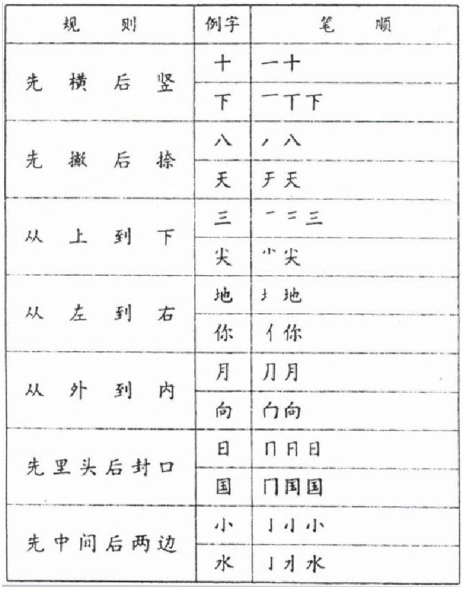 为了方便、流畅地书写汉字,根据汉字结构特征、常用书写工具、书写姿势、书写时的肢体动作及书写笔程,人们从历代书写经验中总结归纳出了汉字笔顺基本规则。该基本规则适用于绝大部分汉字的书写,有少数汉字的书写笔顺不尽一致,教师可以灵活把握。行书、草书的书写笔顺变化较多,但也有规律可循,教学中需结合经典碑帖予以指导。
