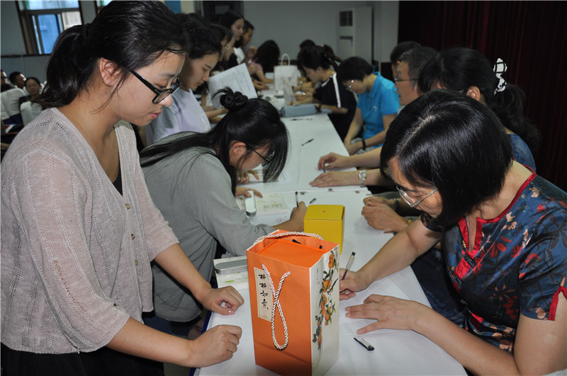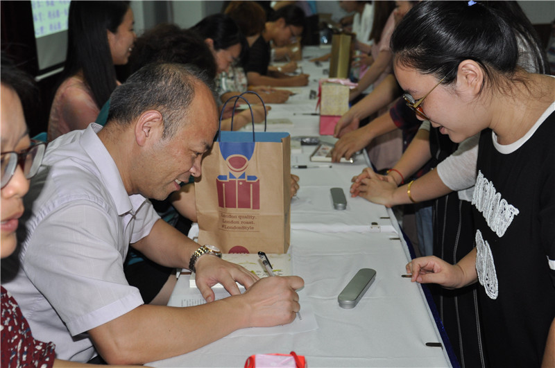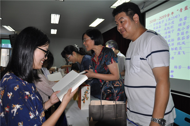 拜师仪式在音乐声中开始,师傅们在台上就坐,38位徒弟分批上台向自己的师傅鞠躬拜师,送上了贴心的小礼物,感谢师傅在今后一年中对自己的辛苦指导;师傅们则向徒弟赠书一本:《我喜欢生命本来的样子》/ 《做一个不再瞎忙的班主任》在每本书的扉页上,师傅们都特意为徒弟写下了自己的教育理念或赠言,勉励徒弟们在教育教学中不断成长。