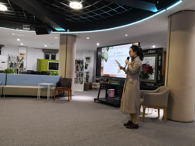 今天培训活动的形式是学习《百家讲坛》的特别节目《平语近人——习近平总书记用典》,这个系列节目,能让大家更加了解习近平总书记,靠近他的思想和精神,感受其人格魅力。党总支请了易相鸥、张小霞、匡欣怡、张静四位老师先期学习了节目内容,四位老师依次给大家带来自己的学习内容分享,听完各位主讲教师的分享,大家充分发表自己的想法进行互动,整个学习活动很成功,大家讨论热烈。最后,诸校长对学习活动进行点评:首先,诸校长勉励老师们铭记习近平总书记提到过的现代人才学中的一个理论——“蓄电池理论”,勉励老师们做一块高效能的蓄电池,不间断地、持续地充电,只有这样才能不间断地、持续地释放能量。然后,诸校长谈到了理想信念,文化自信,谈到为什么入党的问题,勉励大家早日加入到党组织的大家庭。最后,她还提出大家在忙碌之余,应抽时间陪伴家人,建立和谐的家庭,只有这样才能更好的去工作。