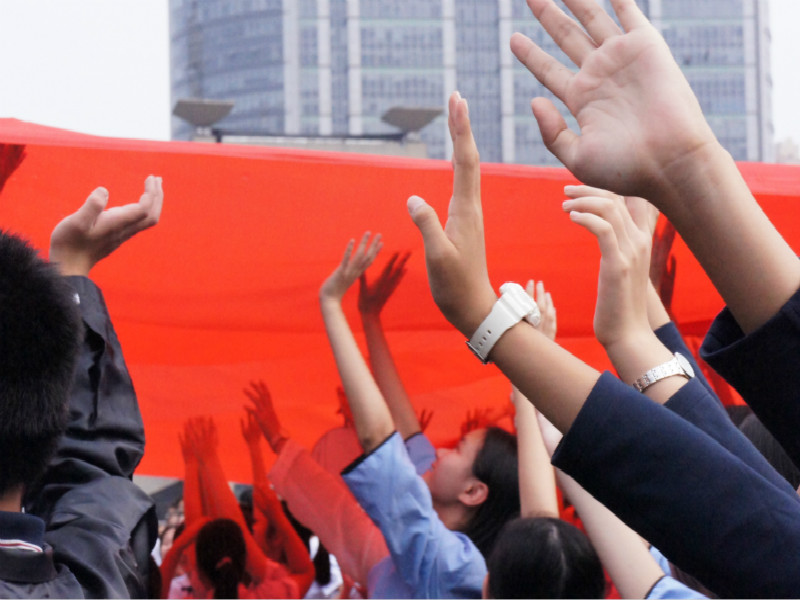 在全场师生嘹亮的歌声中,中华人民共和国国旗在场上各个方阵中传递,同学们难以抑制内心激动的心情,纷纷抬头仰望这浸透着先烈鲜血,承载着千万华夏子孙拳拳爱国之情的国旗。国之泱泱,赖之以民;民之众众,聚之以魂。此刻,万众诚诚,向祖国母亲献礼。