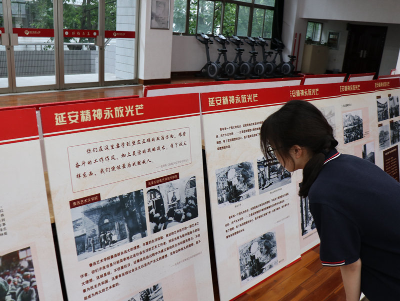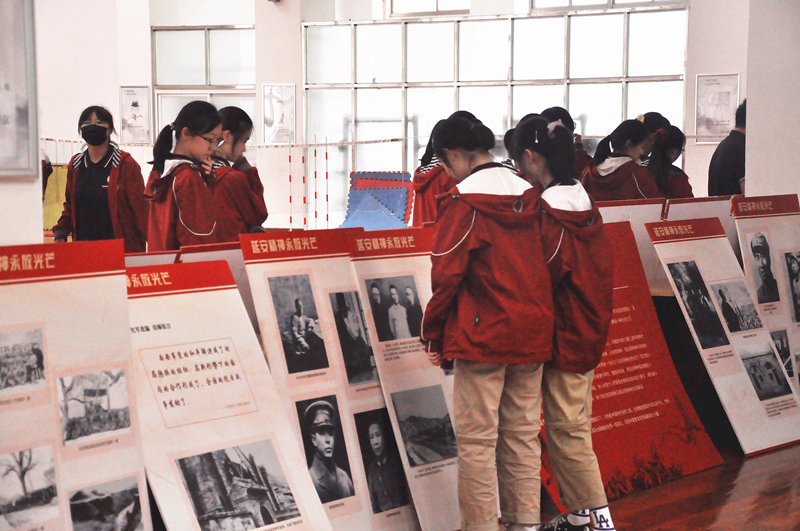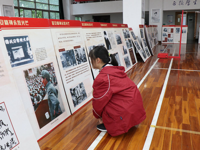 六十余张展板,每一块都记录着共产党人艰苦奋斗的延安故事,凝聚着共产党人全心全意为人民服务的延安精神。同学们聚集在各展板前争先恐后地观看展板上的延安故事,领会“延安精神”的深刻内涵。