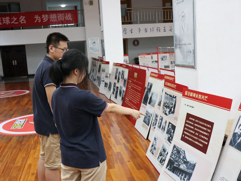 2020年6月18日,南京九中高一(3)班、高一(6)班的同学们在班主任老师的带领下,排着整齐的纵队步入体育馆二楼展览区,参观此次主题为“延安精神永放光芒”的展览。