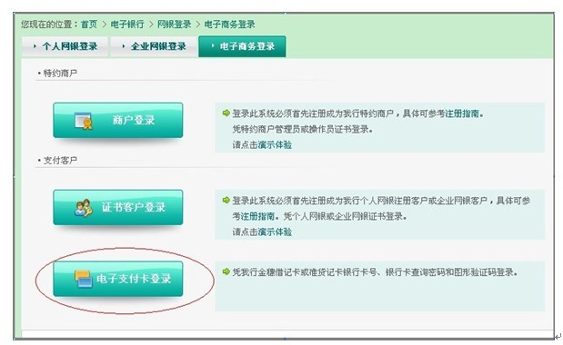 2.考生打开“电子商务登陆”后打开页面,选择“电子支付卡登陆”,页面如下:
